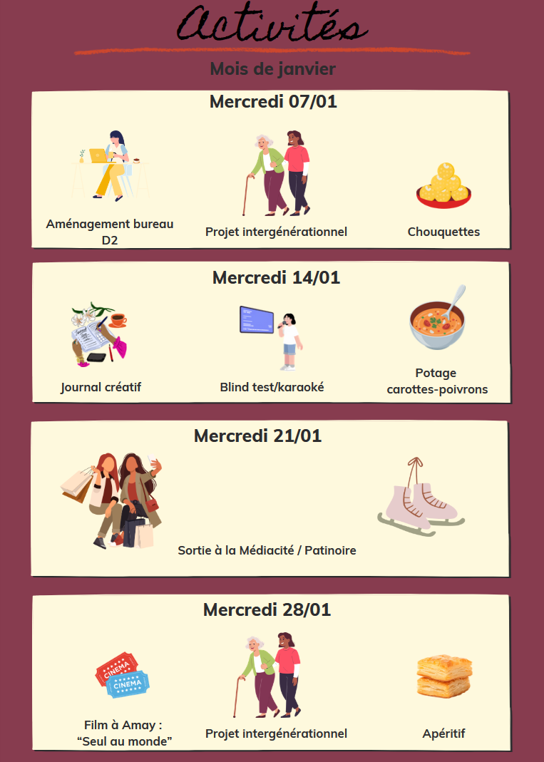 Celles-ci sont culturelles, sportives, créatives ou encore culinaires afin de leur permettre de s'épanouir autour de projets communs.